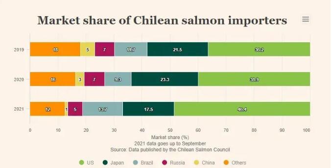 智利產地三文魚也呈現出供應減少、價格上浮的情況。據智利三文魚協會(ChileanSalmonCouncil)統計數據顯示,智利2021年第三季度出口約14萬噸養(yǎng)殖鮭鱒魚類,同比下降16%。從智利2021年1-9月的數據來看,美國、巴西的需求已恢復至疫情前水平,餐飲渠道需求的恢復和開發(fā)推動了智利三文魚對美國市場的出口量增加,并將價格維持在較高水平。而中國市場則尚未恢復,從2020年中期開始,市場需求一路下滑,雖然2021年第三季度同比增長20%,但仍低于疫情前的水平。