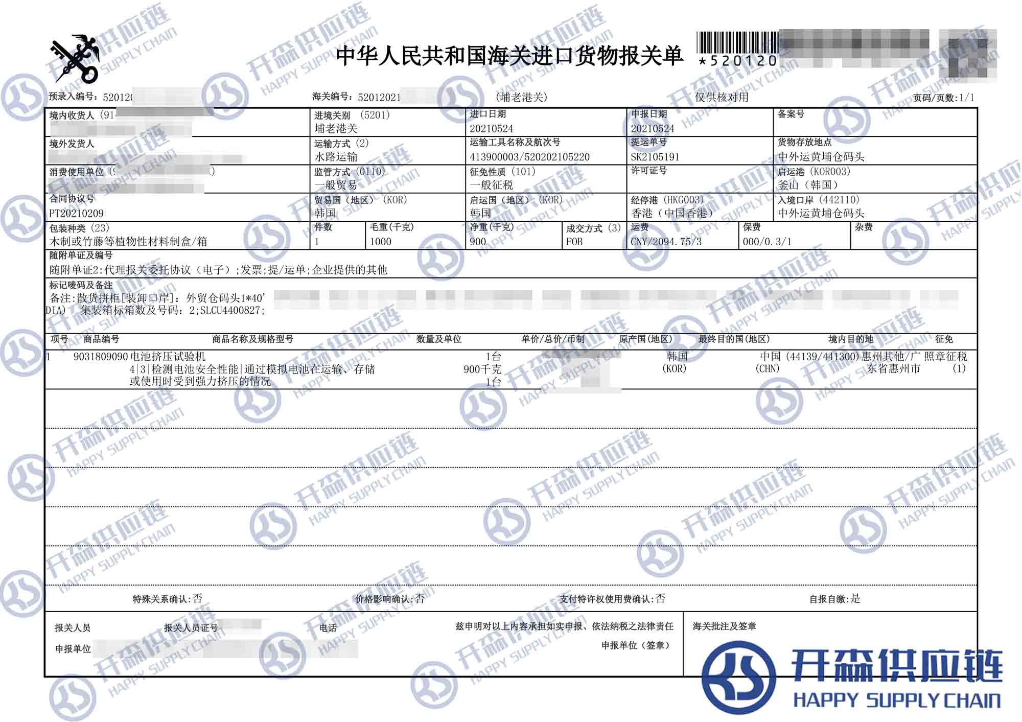 韓國(guó)電池?cái)D壓試驗(yàn)機(jī)進(jìn)口報(bào)關(guān)代理服務(wù)【進(jìn)口案例】