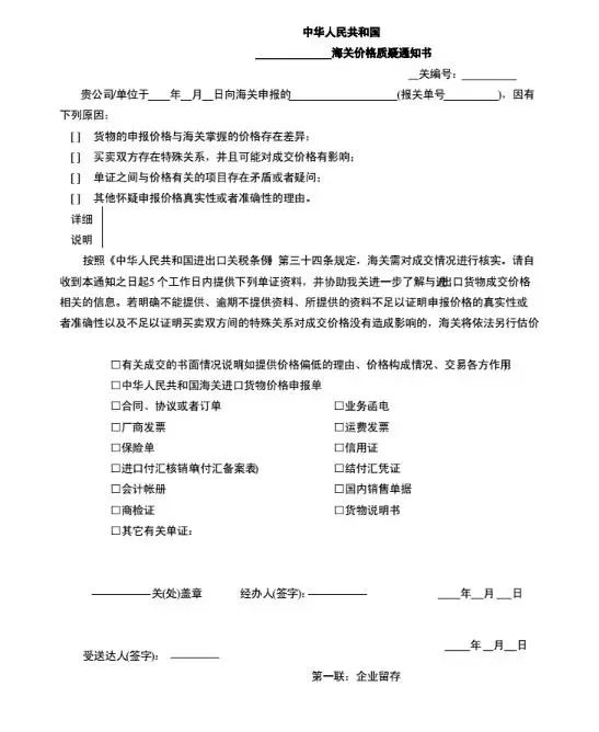 自收到《海關(guān)價(jià)格質(zhì)疑通知書》之日起5個(gè)工作日內(nèi),以書面形式提供相關(guān)資料(如提供價(jià)格偏低的理由、價(jià)格構(gòu)成情況、交易各方作用的情況說(shuō)明,《中華人民共和國(guó)海關(guān)進(jìn)出口貨物價(jià)格補(bǔ)充申報(bào)單》,合同、協(xié)議或者訂單,業(yè)務(wù)函電,廠商發(fā)票,運(yùn)費(fèi)發(fā)票,保險(xiǎn)單,結(jié)付匯憑證,貨物說(shuō)明書等),以證明其申報(bào)價(jià)格真實(shí)、準(zhǔn)確或買賣雙方之間的特殊關(guān)系未影響成交價(jià)格。